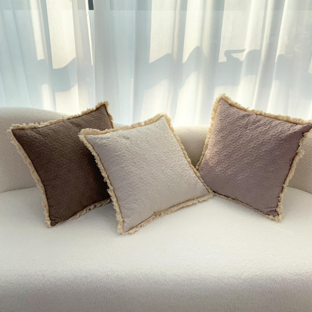 This stylish throw pillow cover showcases delicate and intricate floral embroidery in subtle mauve shade, adding a touch of sophistication and natural beauty to the overall visual impact. The fringe detailing around the edges brings texture and playful element to the pillow, making it suitable for various interior styles.